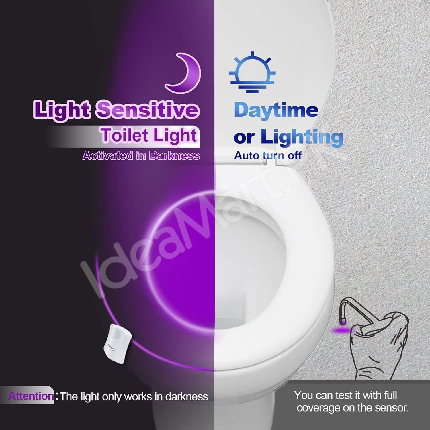 Brighten your bathroom with our toilet light lamp. It has a smart light sensor that reads room light and a motion sensor that turns the lamp on when someone approaches. The lamp offers bright color lighting and a UV purple mode for extra cleaning support, giving both a fun and useful bathroom light at night.