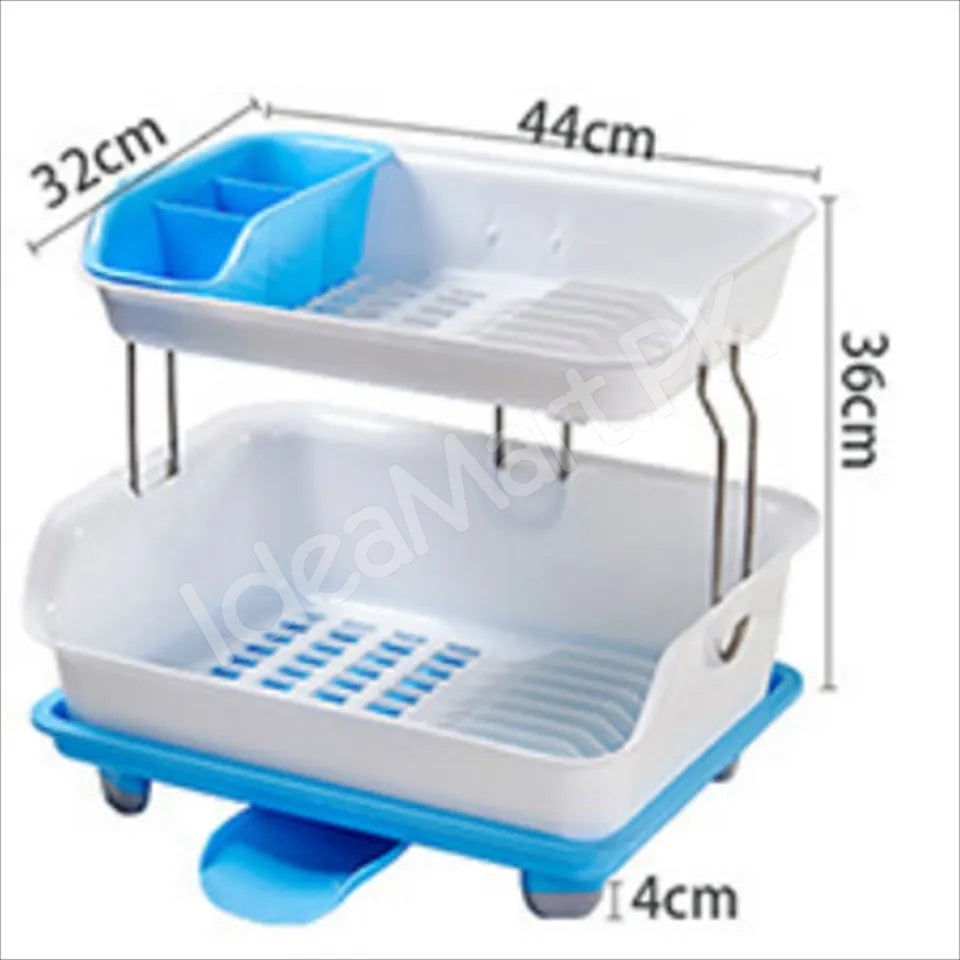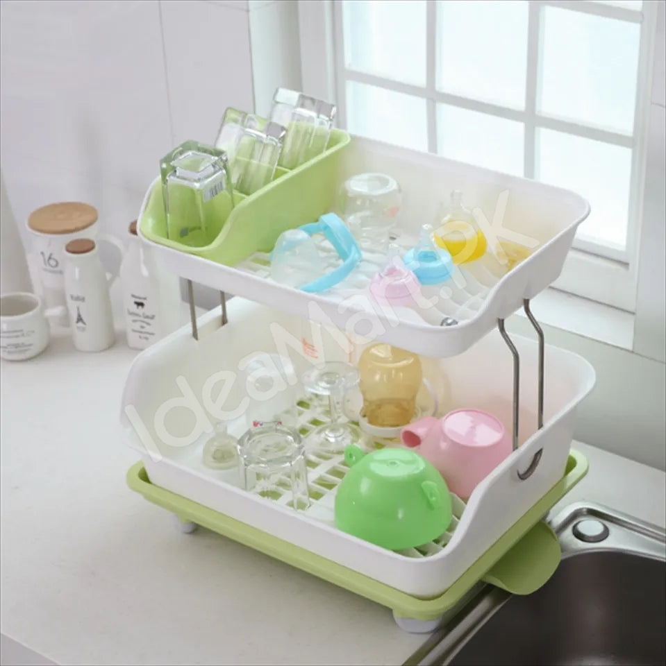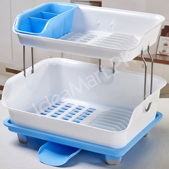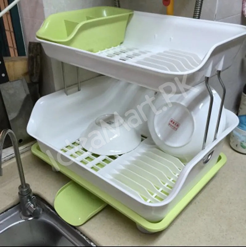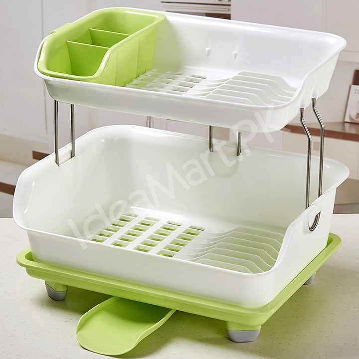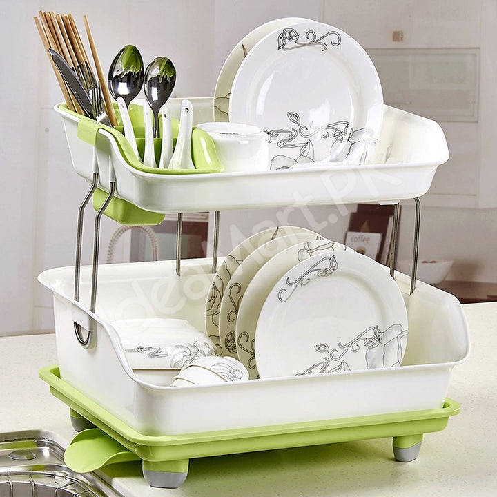 Organize your kitchen with this two-tier Dish Drying Rack, featuring a drip tray and utensil holder. A practical space-saving choice for homes in Pakistan.