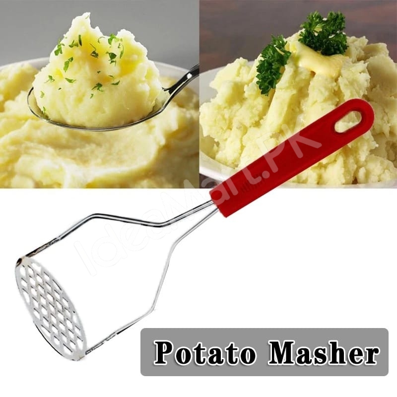 This potato masher, stainless steel tool makes it easy to prepare smooth mashed potatoes and vegetables, commonly used in Pakistan for daily cooking.