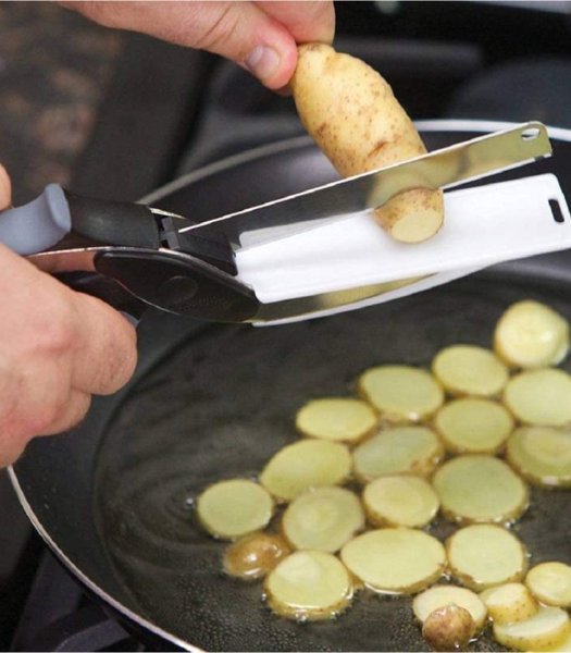 - Revolutionary 2-in-1 knife and cutting board that slices your favorite food in seconds.