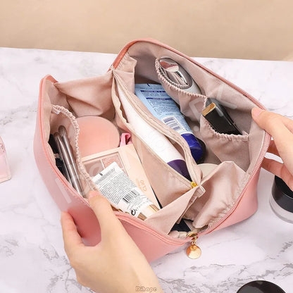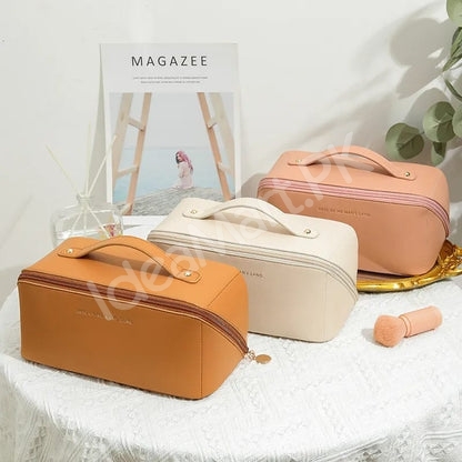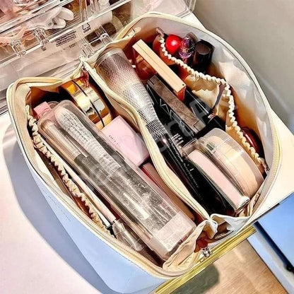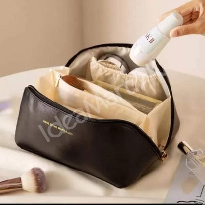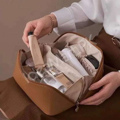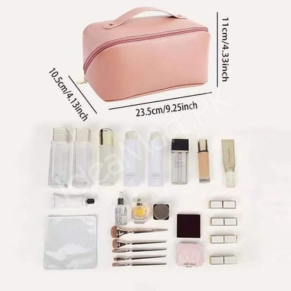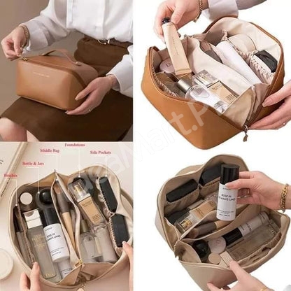 Leather Cosmetic Bag with Handle & Multiple Grids for Toiletry Storage