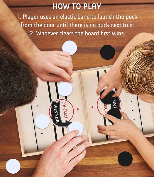 - Start the game and place five pucks on each side of the board. Slide both ends of the elastic band into the side grooves so that they snap into place. Whoever clears the board first wins.